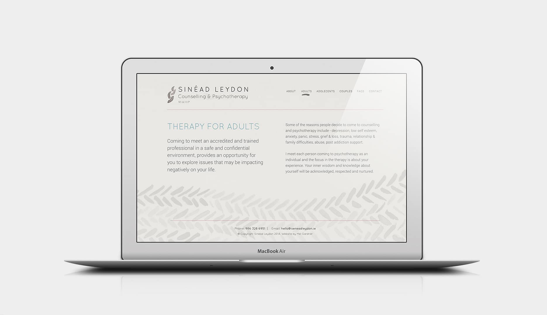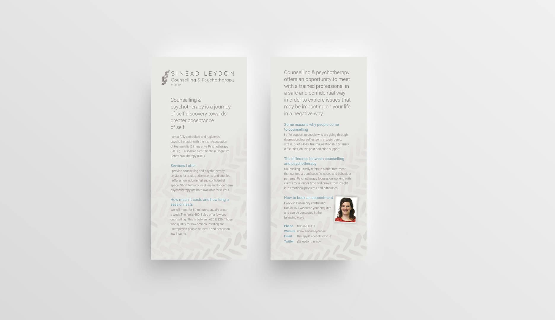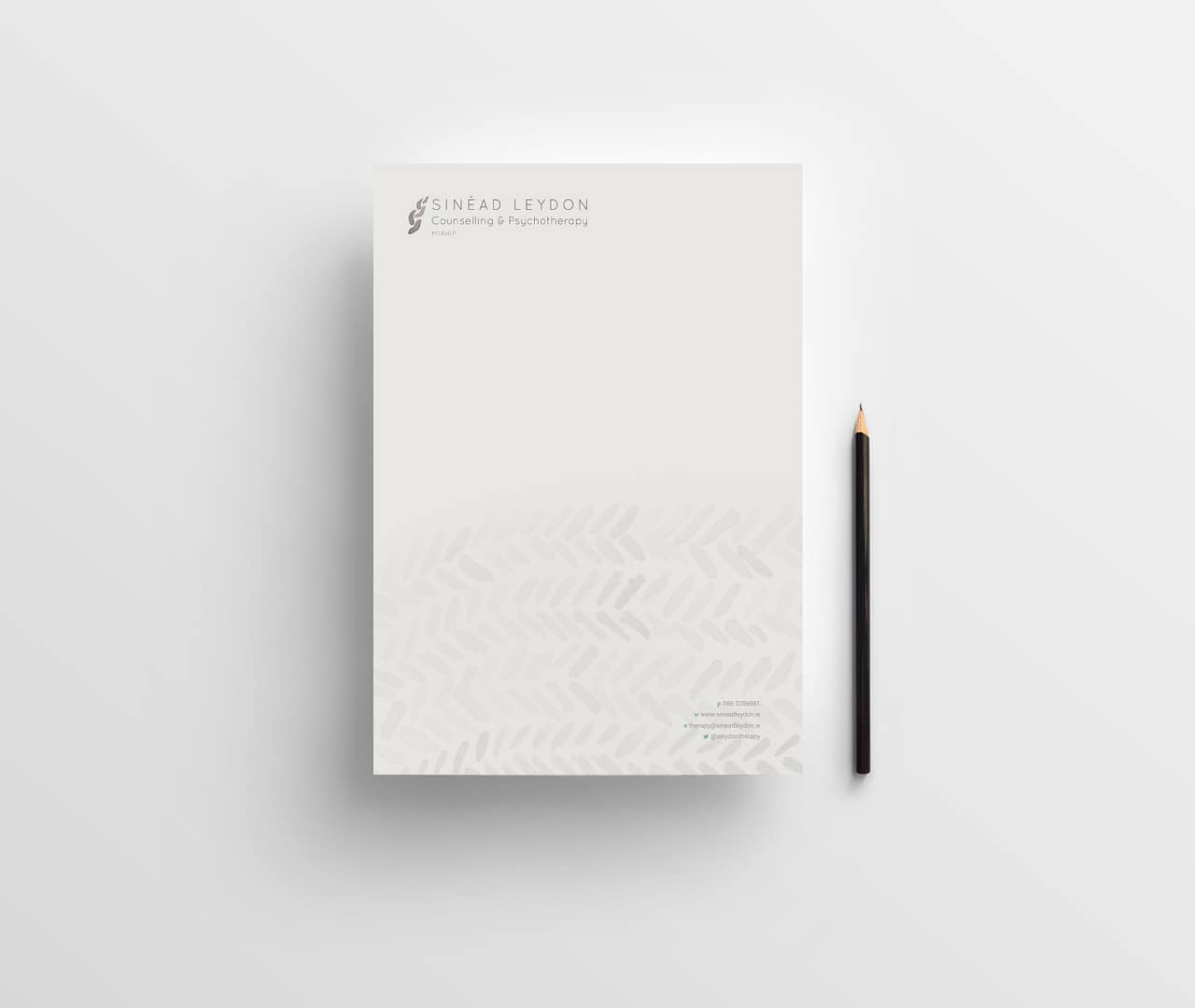 Sinead Leydon approached me to work with her on branding her therapy practise. She wanted something was unique, humanistic and was photograph free. Sinead really liked the idea of weaving imagery as she felt it illustrated integration; which is what therapy is about. She also soft natural muted colours. The weaving imagery was illustrated using watery ink on thick watercolour paper, the beautiful tonal variation of the watercolours gave it movement and depth. This provided a motif that was used across the brand. When combined soft colours – a beige, pink and blue, it gave a very calming and human feel.